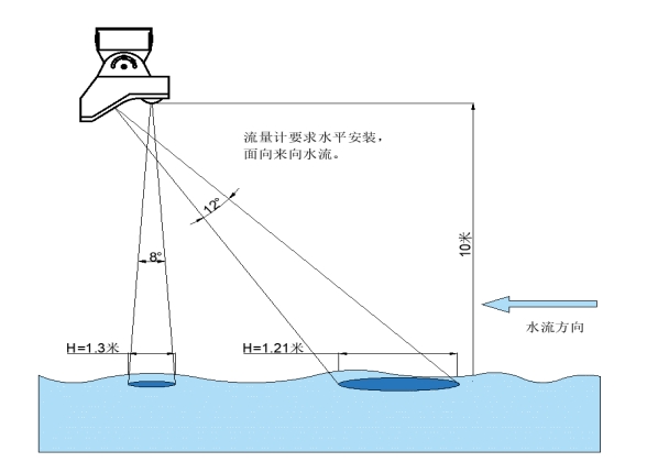 为了确保流量计的精准测量,保证流量计位于水面中央且垂直于水面。倾斜会使信号幅度变弱,影响正常测量,建议将斜面流速天线朝向水流的上游,即迎水方向,水流速度显示为正向速度。